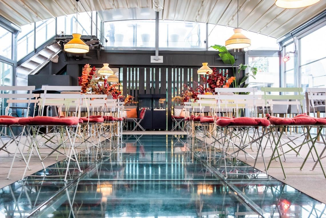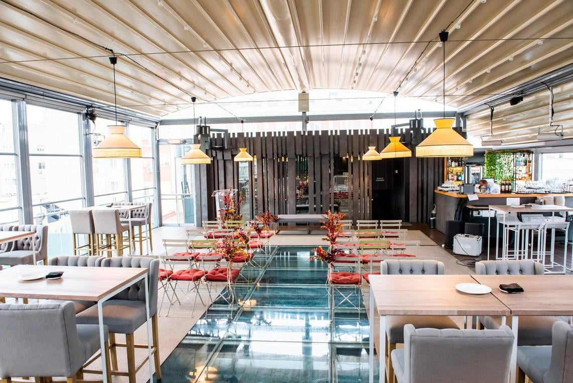 El espacio tiene dos alturas, una con suelo de madera y otra con suelo de cristal, bajo el que se oculta la piscina del Hotel. Es un lugar inigualable para ofrecer el cóctel a vuestros invitados o celebrar una ceremonia civil