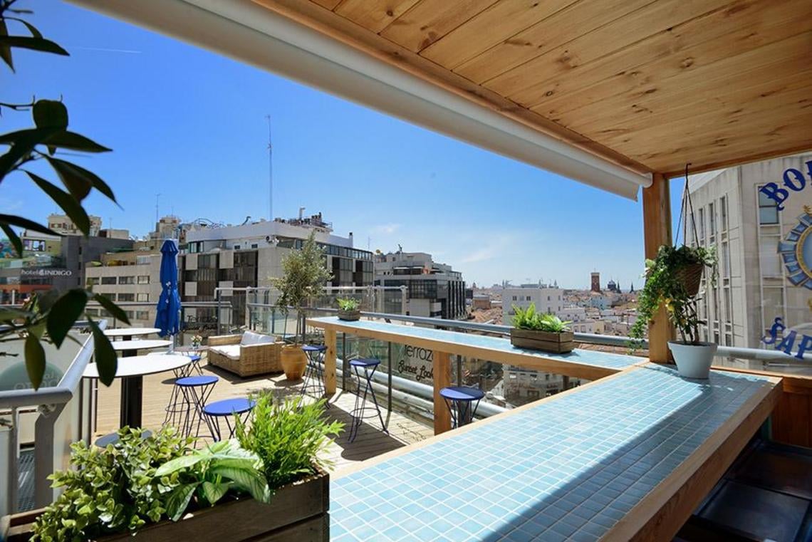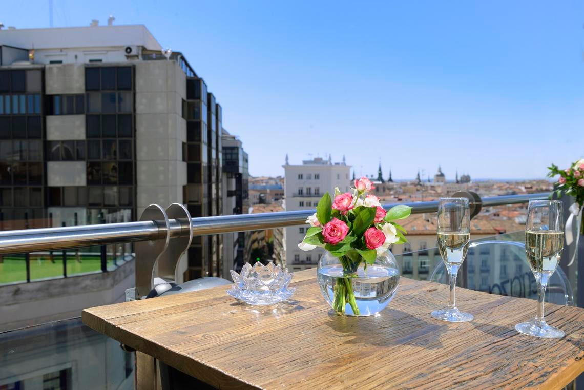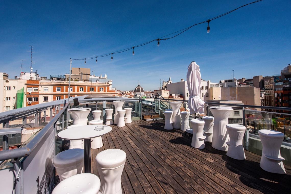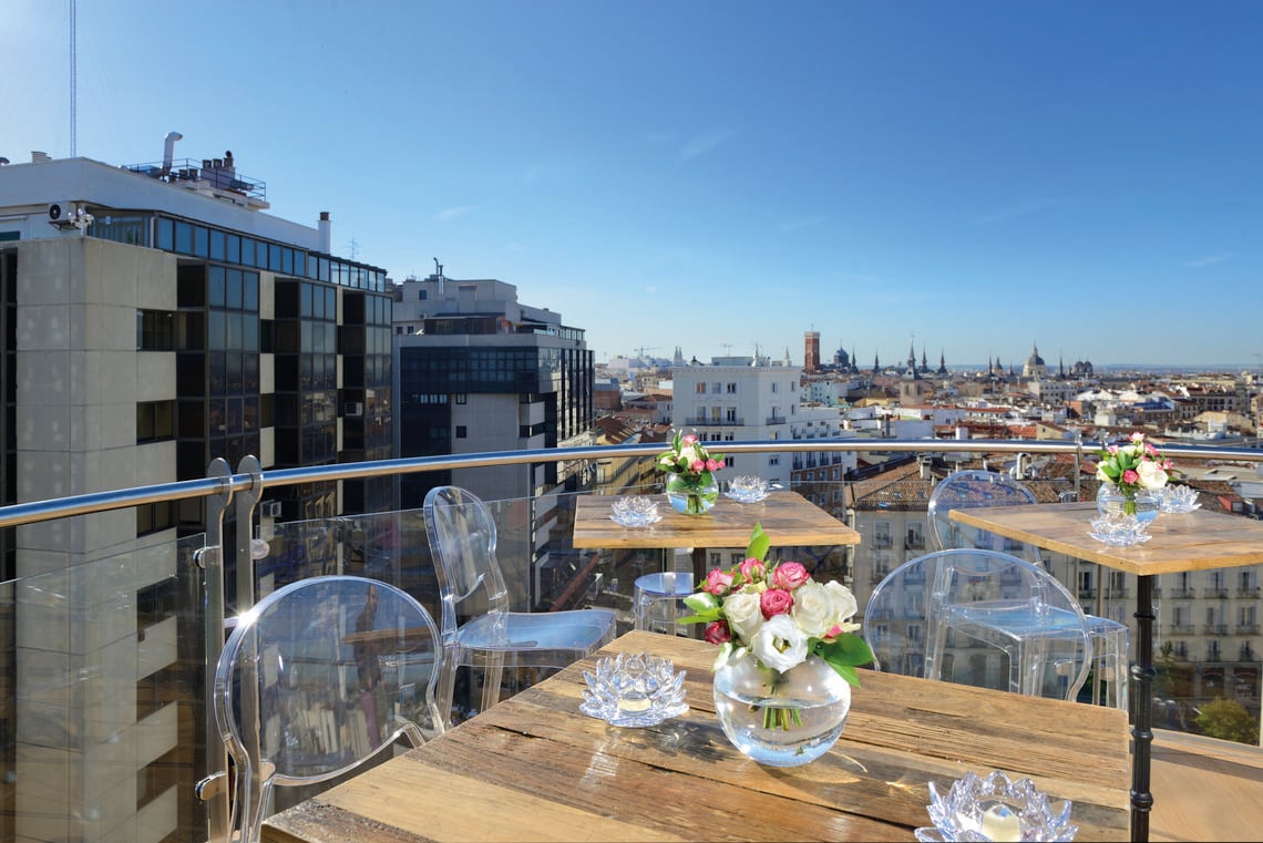 La terraza que se ubica en la séptima planta del Inhala Hotel Garden, ofrece unas magníficas vistas al Madrid de los Austrias, a las plazas de España y Santo Domingo, al Palacio Real y al jardín vertical que en el 2011 recibió el Record Guiness al jardín vertical más grande del mundo.